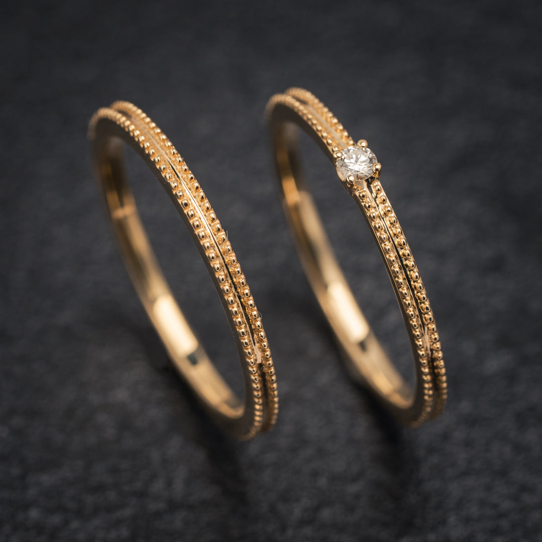 A single diamond sparkles at the center of a slender 18k gold band, framed by intricate milgrain detailing that enhances its soft glow. Handcrafted with quiet precision, this ring celebrates minimal beauty and timeless design — perfect for stacking or wearing on its own as a touch of everyday elegance.