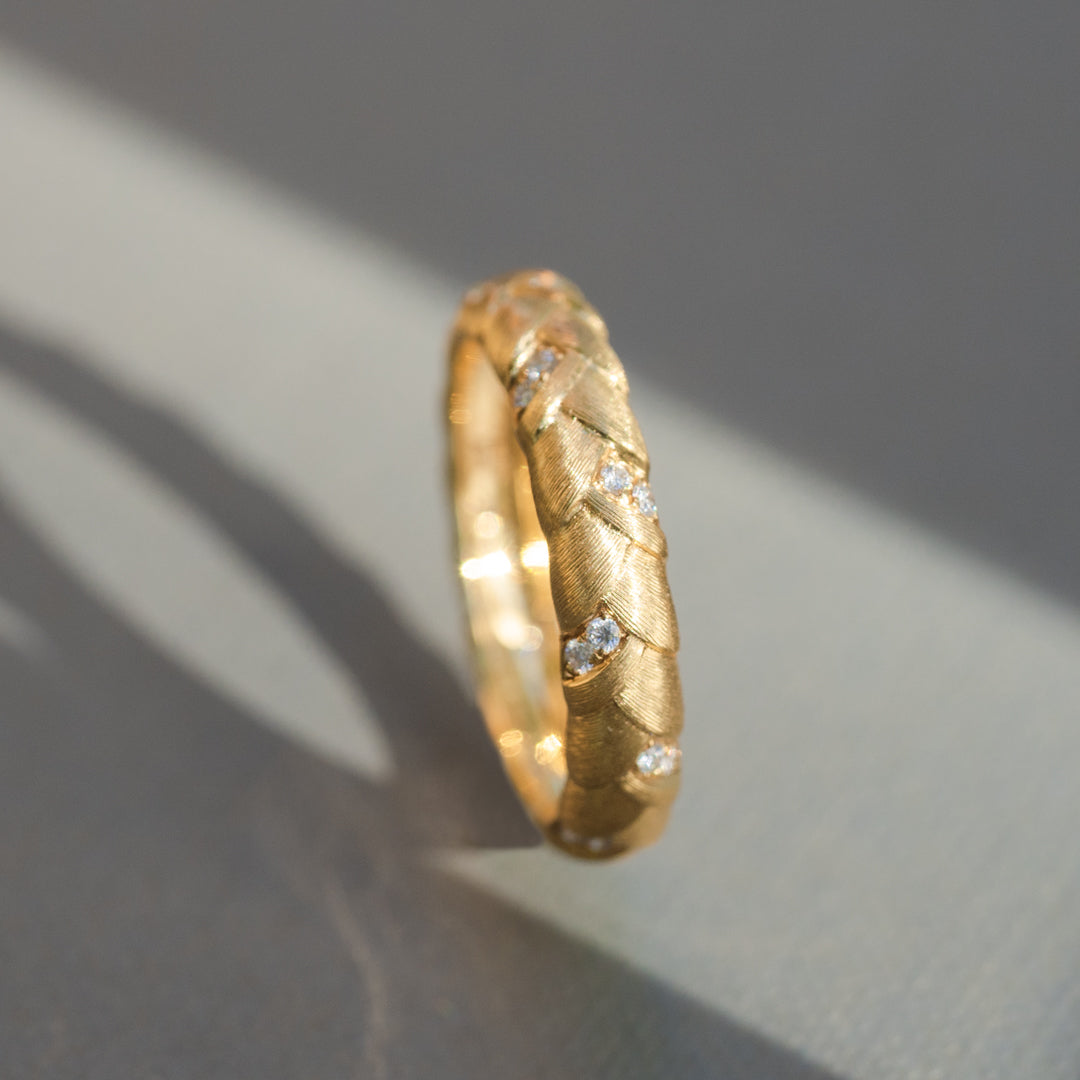 Hand-engraved in 18k yellow gold, this band traces nature’s quiet rhythm through its golden veins. Each engraved line is carved by hand, revealing organic movement and texture. Scattered diamonds shimmer along the band like dew caught in morning light — subtle, timeless, and alive with craftsmanship.